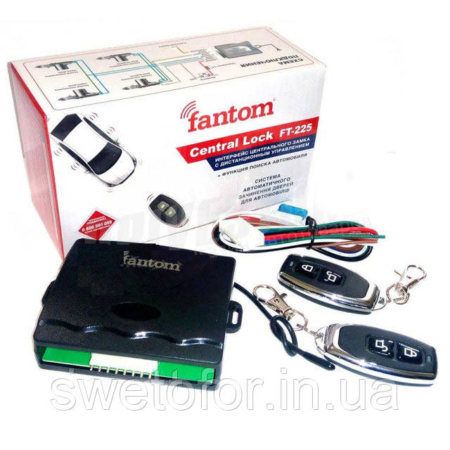 Комплект Fantom FT-225 — одна з найпопулярніших моделей інтерфейсів керування ЦЗ. До цього комплекту входять: 1 інтерфейс, 2 двокнопкові брелоки дистанційного керування й інструкція зі встановлення. Дальність дії системи — до 50 метрів. Реалізована функція пошуку автомобіля.